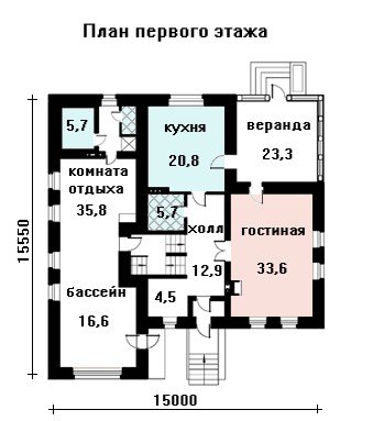 Вход в дом организован с высокого крыльца через небольшой тамбур, за которым следует просторный холл с лестницей, делящей пространство первого этажа на две части. В правой половине находятся помещения кухни и гостиной с камином, которые связаны друг с другом через застеклённую веранду. В левой половине дома находится зона активного отдыха с бассейном.