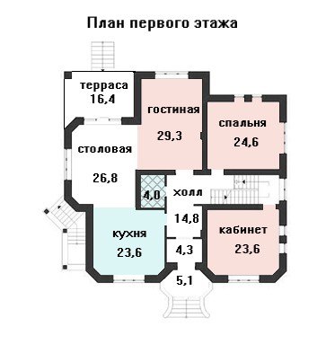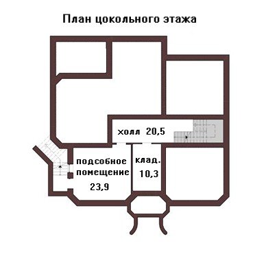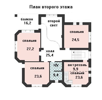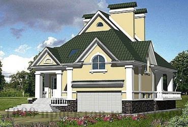 В небольшом цоколе запроектировано подсобное помещение и небольшая кладовая. На первом этаже находится одна из спален, что несомненно удобно при наличии пожилых членов семьи. Однако, если таковых нет, то данную комнату можно легко переоборудовать в кабинет или мастерскую. Скошенные углы дома в кухне и помещении столовой придают особое изящество интерьеру. Гостиная имеет второй свет, который освещает холл второго этажа, окруженного тремя спальнями.