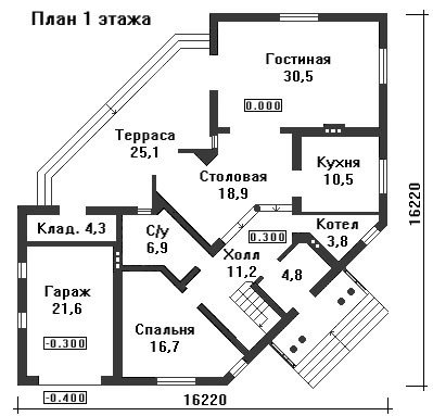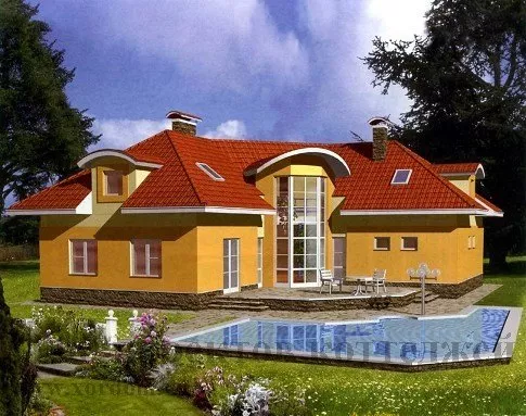 Добротный загородный дом с оригинальным композиционным решением – формированием изогнутой формы, в результате которого создаётся небольшой внутренний дворик, являющийся внешним и вполне функциональным продолжением внутреннего интерьера дома. Парадный вход организован по средней оси особняка и украшен стилизованным портиком. На территории тамбура имеется достаточно места для устройства гардеробных шкафов. Далее за тамбуром следуют прихожая, и за ней, на более высоком уровне, столовая, кухня и гостиная. Часть помещения столовой с обеденным столом организована как двусветное помещение, свет в которое падает через обращённый во двор эркер.