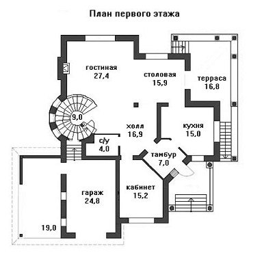 Двусветная гостиная и столовая составляют единое пространство с камином и практически не отделены от территории холла. Кухня и кабинет имеют почти равную площадь – по 15 кв. м. и находятся так же на первом этаже.