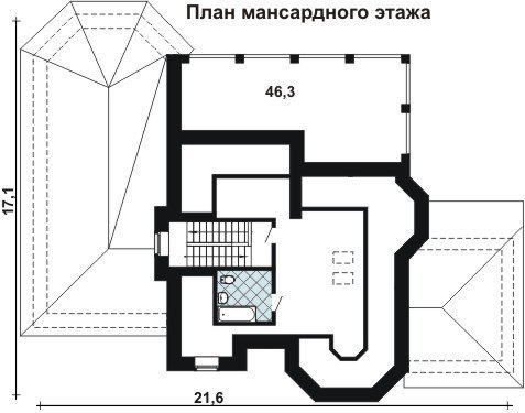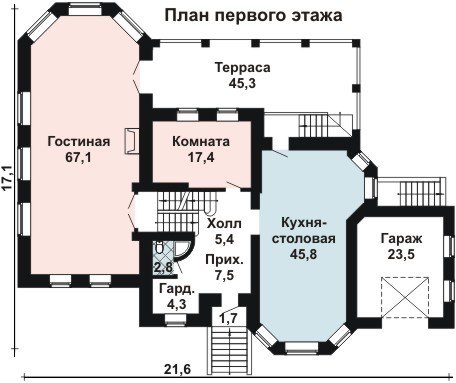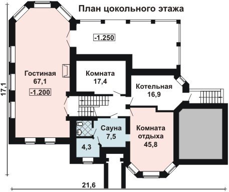 Проект представляет четырехуровневый особняк с цоколем и мансардой. Так же в доме предусмотрены две гостиные комнаты, обе площадью 67,1 кв. м., расположенные друг над другом, одна на первом этаже, вторая – в цоколе. Гараж, расположенный по правую сторону от парадного входа, рассчитан на один автомобиль. За домом запроектирована большая терраса размером 45,3 кв. м.