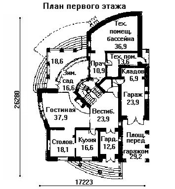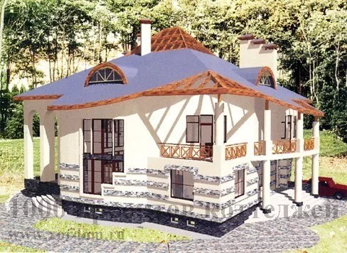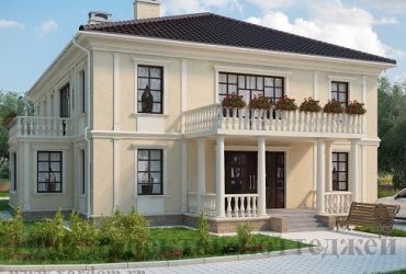 Необычный коттедж из кирпича, оформленный в стиле постмодернизма, выглядит современно и в то же время подчеркивает индивидуальность своих хозяев. Изюминкой внутренней планировки являются двусветный вестибюль, гостиная комната размером 37,9 кв. м. и зимний сад, из которого можно выйти на крытую террасу. Все хозяйственные и вспомогательные помещения располагаются так же на первом этаже и включают в себя прачечную, кладовую и технические помещения. Интересно, что перед одноместным гаражом предусмотрена дополнительная площадка, которая может выполнять роль дополнительного парковочного места для второго автомобиля.