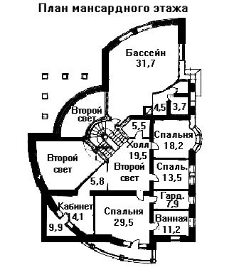 Мансарда достаточно уникальна в плане состава помещений. Здесь главным акцентом является довольно большой бассейн, комната под который занимает территорию в 31,7 кв. м. Три небольшие спальни находятся через холл от него, а напротив размещен кабинет.