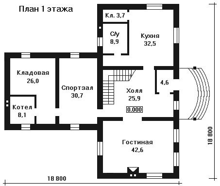 Пространство первого этажа поделено на три равные части. Центральная часть – это просторный двусветный холл с лестницей, справа – каминный зал, слева – кухня-столовая с кладовой и санузлом. В задней части холла имеется выход в одноэтажную пристройку, где находятся спортзал, кладовая и котельная.