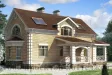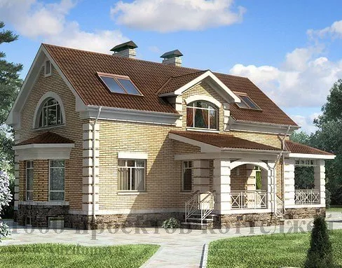 Двухэтажный загородный коттедж, с обилием элементов архитектурного декора в отделке фасада, который придаёт внешнему облику дома особую выразительность и шик. Массивные пилоны украшают парадный вход в дом, и такие же колонны поддерживают навес небольшой уютной террасы.
