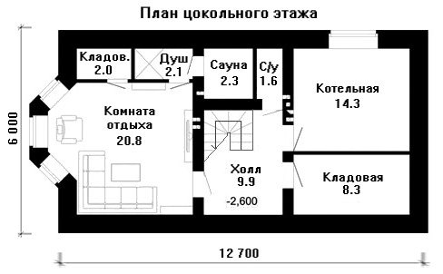 Под всей площадью дома находится цокольный этаж, который поделён на две зоны, на одной половине этажа разместился банный комплекс – с сауной, комнатой отдыха, душевой и кладовой для хранения банных принадлежностей, вторая половина этажа отведена под технические нужды и винный погреб.