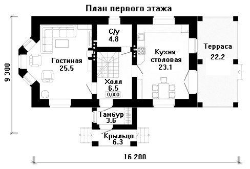 Помещение первого этажа поделено пополам уютным холлом с лестницей, по обе стороны от которого находятся помещения для дневного пребывания - это кухня, совмещённая со столовой, и гостиная с эркером и камином.
