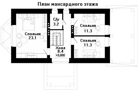 На втором этаже находятся три спальни и санузел.