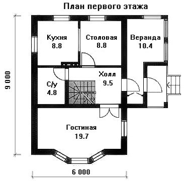 Зона дневного пребывания на первом этаже предполагает минимум помещений, по обе стороны от небольшого холла обустроены просторная гостиная, из эркера которой открывается замечательный вид в сад, столовая и кухня, соединённые широким арочным проёмом. По лестнице, находящейся в холле, можно спуститься на цокольный этаж или подняться в мансарду.