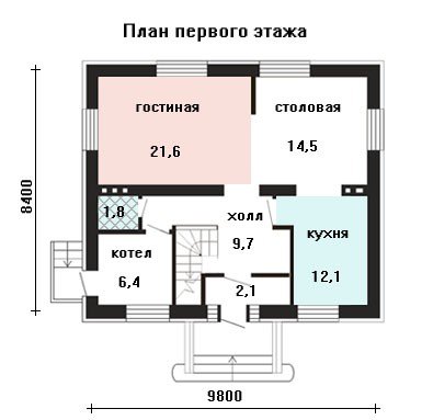 Площадь дома относительно небольшая, потому планировочное решение внутреннего пространства продумано с особой тщательностью. Половину первого этажа занимают помещения кухни, санузла, холл с лестницей и котельная, в которую предусмотрен также отдельный вход со стороны участка. Вторая половина этажа - это столовая и гостиная, разделённые небольшой перегородкой. В гостиной предусмотрена возможность установки небольшого настоящего камина.