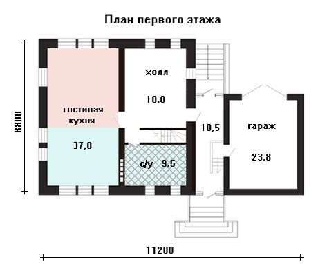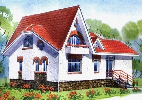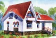 Уютный загородный коттедж, с остроконечной крышей, простыми строгими фасадами, достаточно компактный, потому для его возведения не требуются участки большой площади, предназначен для сезонного проживания небольшой по составу семьи. Гараж для одной автомашины организован в виде пристройки к основному объёму здания, между пристройкой и домом сформирован сквозной коридор, по обоим концам которого находятся входы в дом: один со стороны фасада, другой – с противоположной фасаду стороны, обращённой в сад.