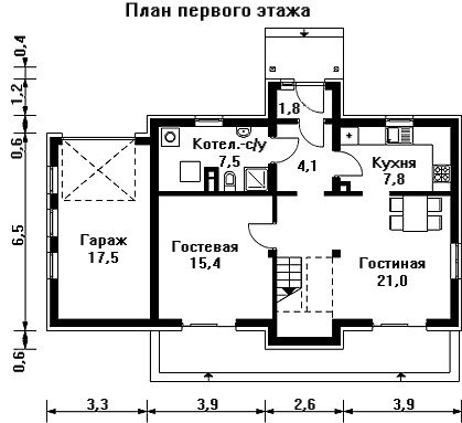 По обе стороны от небольшой прихожей находятся санузел, совмещённый с котельной, и кухня. За прихожей следует просторное помещение гостиной, которая является по совместительству и столовой, от кухни её отделяет небольшой арочный проём. Также на этаже имеется гостевая спальня.