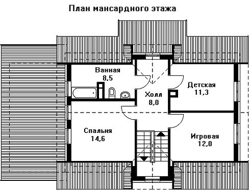 По лестнице из гостиной попадаем в мансарду, где разместилась приватная зона - это три спальни для хозяев дома и членов семьи, а также просторная ванная комната.