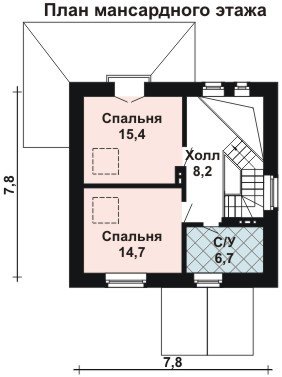 По центру первого этажа расположен холл, который ведёт в котельное помещение, кухню-столовую, санузел и, конечно же, в светлую гостиную. Также здесь расположена спальная комната для гостей. Угловую часть гостиной занимает лестница на мансардный этаж. Здесь удобно расположились две комфортабельных спальные комнаты, одна из которых выходит на балкон. На мансарде имеется отдельный санузел.