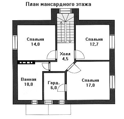 На мансардном этаже находятся сгруппированные вокруг небольшого холла три спальни, ванная комната и гардероб.