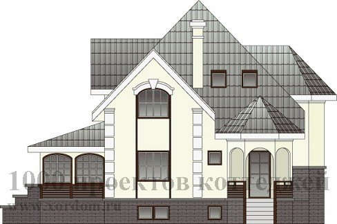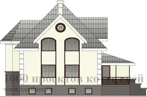 Респектабельный загородный особняк с элементами замкового стиля, двумя оригинальными эркерами, стилизованными под башни, элегантной остеклённой верандой с зимним садом. Фасад дома украшен стильными элементами декора, выразительными арочными окнами с характерным остеклением. Вход в дом выполнен через небольшую башню-эркер.