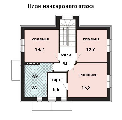 В приват-зоне на мансардном этаже удачно разместились просторная ванная комната и три спальни, одна из них с гардеробной комнатой.