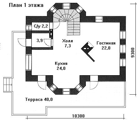 Настоящим украшением дома служат два эркера, размещённых на фасадной и тыльной сторонах дома. Площадь первого этажа - это единое целое пространство для дневного пребывания из кухни и гостиной, в центре которого установлен большой настоящий камин.