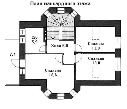 На мансардном этаже в приват-зоне находятся три спальни и ванная комната. Спальня хозяев дома - это апартаменты с выходом на террасу и эркером, котором можно использовать в качестве будуара.