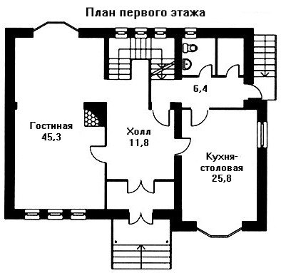 Первый этаж поделён на две части просторным холлом. Главным украшением этажа является внушительных размеров каминный зал с эркером. Кухня-столовая также размещается в помещении с эркером, из которого открывается прекрасный вид в сад.