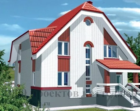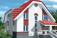 Двухэтажный коттедж современных форм и дизайна предназначен для постоянного проживания. Его стильный образ формируют удачно подобранная отделка фасада, выразительные изгибы контрастирующей с фасадом кровли, главный вход с эффектным козырьком, организованный с высокого крыльца в фасадной части дома.