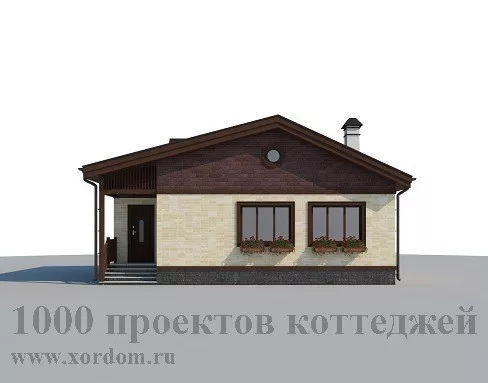 Проект данного одноэтажного загородного дома из кирпича является воплощением того, как небольшая площадь жилья может использоваться максимально полезно. Следует также отметить и то, что согласно проекту дом рассчитан на проживание небольшой семьи или молодой пары. Вход в помещение дома находится со стороны заднего дворика через небольшое уютное крыльцо, ведущее в тамбур. Компактный и светлый холл позволяет пройти в котельное помещение, одну из двух уютных спальных комнат, санузел с ванной комнатой, а также объединенное помещение кухни-столовой с гостиной. Иногда гостиная может использоваться в качестве спальной комнаты. Построить такой дом из кирпича можно всего лишь за 2 662 118 руб. – цена указана за строительство под ключ.