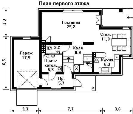 На первом этаже компактно разместился хозяйственно-бытовой блок помещений и зона дневного пребывания и приёма гостей, в которую входит кухня, столовая и гостиная в виде трёх плавно перетекающих друг в друга площадей. В гостиной предусмотрена возможность установки большого углового настоящего камина и имеется выход на крытую террасу, обращённую в сад.