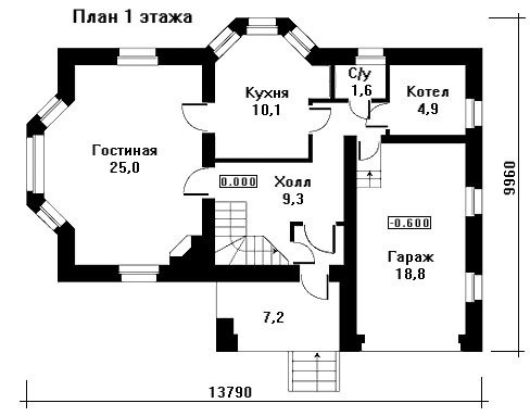 Внутренний объём дома спланирован с особой тщательностью, на сравнительно небольшой площади удалось удобно разместить все жизненно необходимые помещения для достижения высокого уровня удобства и комфорта. На первом этаже отведено место помещениям дневного пребывания - это кухня, которая разместилась в небольшом светлом эркере, и гостиная, исполняющая по совместительству роль столовой: обеденный стол очень удобно размещается в трёхгранном эркере, из которого прекрасно просматривается окружающий ландшафт.