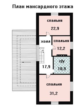 Из холла первого этажа по лестнице попадаем в просторный холл мансарды, где удачно разместились три разновеликие по площади спальни и ванная комната.