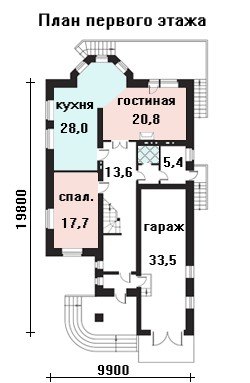На первом этаже в передней части дома находится встроенный гараж на две автомашины. Дальняя часть сформирована помещениями гостиной с камином и кухни, а в соединяющем их эркере разместилась столовая.