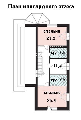Две спальни, два санузла и лоджия составляют помещение мансарды, причём один санузел является персональным для спальни хозяев.