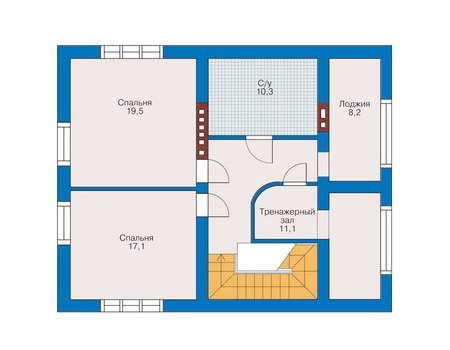 Гостиная комната с угловым камином практически полностью объединена с территорией кухни на первом этаже. Из большого общего холла площадью 20,3 кв. м. помимо гостиной можно пройти в рабочий кабинет размером 8,8 кв. м. Второй этаж включает в себя не только две уютные спальни, но и маленький обособленный спортзал площадью 11,1 кв. м.
