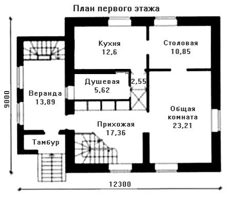 Веранда играет роль тамбура, за которым следует большой холл с разместившейся в углу двухмаршевой лестницей, ведущей на второй этаж. Также на этаже находятся кухня, столовая и гостиная, которые прекрасно сообщаются между собой.