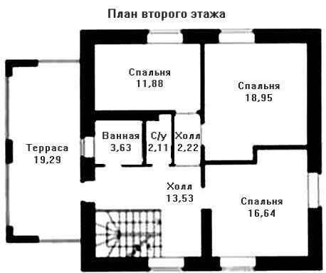 Мансардный этаж, спланированный как зона отдыха, включает в себя три спальни, ванную, гардероб. Из холла можно выйти на большую крытую террасу, которая расположена над верандой.