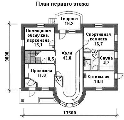 Презентабельный загородный коттедж из кирпича рассчитан на постоянное проживание современной большой семьи, привыкшей к комфорту и максимальным удобствам. Внешне этот трехуровневый особняк отличается приятным «ухоженным» дизайном и наличием оригинальной башенки-бельведера. А внутренняя планировка спроектирована достаточно оригинально, но при этом предусматривает все необходимые для комфортной жизни помещения. Первый этаж разделен между спортзалом с сауной, помещением для обслуживающего персонала и просторным холлом площадью 43 кв. м., а так же вспомогательными хозяйственными помещениями. В одной части холла расположен двухсветный зимний сад.