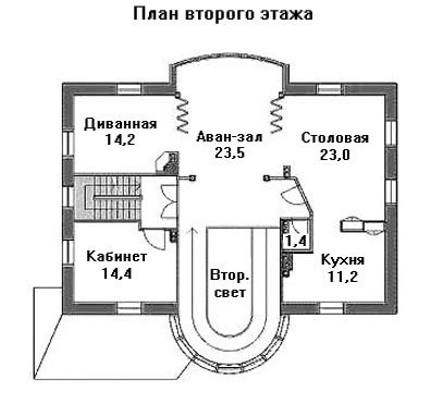 Второй этаж предназначен для полноценного проживания семьи. Тут находится кухня, кабинет, помещение столовой, а так же аван-зал и диванная. Все четыре спальни особняка находятся на третьем этаже и расположены вокруг общего просторного холла размером 21 кв. м., так же имеющим вид на второй свет зимнего сада.