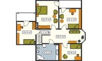 Второй этаж является полностью «хозяйской» территорией и включает в себя четыре спальни размером 9,8 кв. м., 12,1 кв. м., 14,4 кв. м. и 16,9 кв. м. В дополнение на этаже размещен просторный общий санузел площадью 9,6 кв. м.