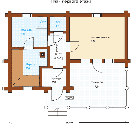 Уютный деревянный особняк из оцилиндрованного бревна предназначен для комфортабельного сезонного отдыха с семьей и гостями. Не очень большие габариты данного коттеджа дают возможность постройки на совершенно небольшом земельном участке. Тут можно приятно провести время с семьей и близкими друзьями. Из комнаты, предназначенной для отдыха, оборудован выход на достаточно большую террасу, расположенную под общей кровлей, что чрезвычайно удобно для отдыха даже в ненастную погоду. При необходимости баня может быть перепланирована в небольшой по площади жилой домик. Благодаря выбору дерева, как главного материала для постройки, можно сказать, что данный особняк является полностью экологичным, так как на сегодняшний день не существует более чистого строительного материала.