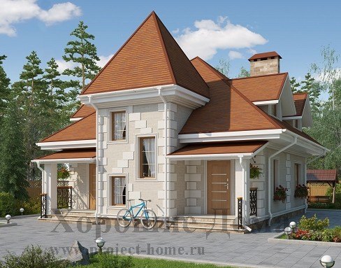 Оригинальный загородный коттедж с эффектным эркером в виде башни, крутой многоскатной крышей, вертикальными мансардными окнами, изысканной отделкой фасада...