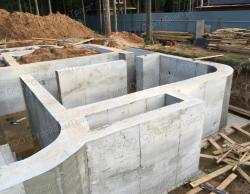 10. По истечении этого времени начали возводить опалубку для стен цокольного этажа. Здесь трудность представляли закруглённые углы. Также следует здесь установить щиты.