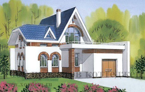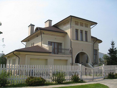 Современный загородный коттедж с классическими формами, симметричным фасадом, многоскатной крутой кровлей, украшенный оригинальными эркерами, выразительно оформленным главным входом с пилонами...