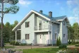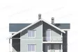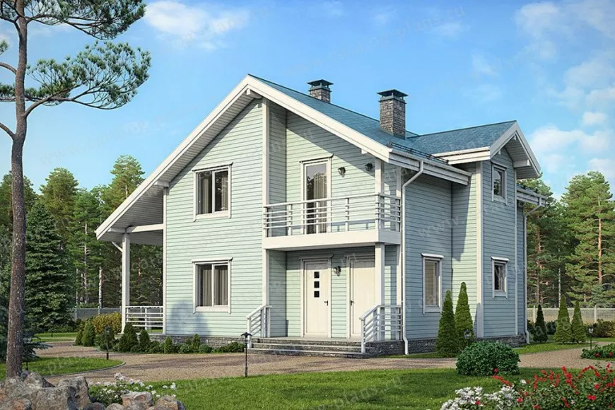 Дом имеет сложную форму, за счет которой выглядит эффектно без дополнительного декора. Стены оформлены сайдингом. Производители предлагают широчайшую палитру для этого отделочного материала, поэтому цвет коттеджа может быть практически любым. Окна и двери украшены красивыми и практичными наличниками. Асимметричная многощипцовая крыша довершает образ уютного и экологичного дома.