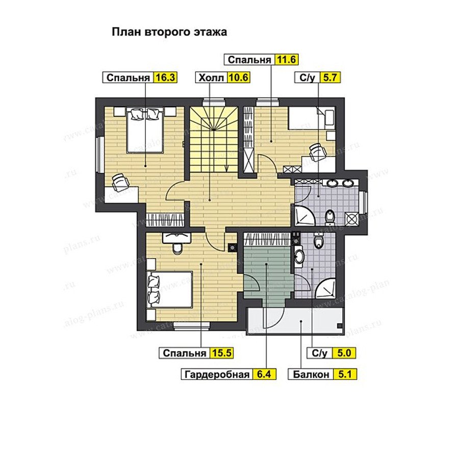 На втором этаже три уютные спальни. Главная спальня (15,5 кв.м) оборудована гардеробной (6,4 кв.м), отдельным санузлом (5 кв.м) и балконом (5,1 кв.м). Две другие комнаты имеют разную форму и площадь (16,3 и 11,6 кв.м), что позволит подобрать оптимальный вариант для каждого члена семьи. Также на этаже есть общий санузел (5,7 кв.м) и холл (10,6 кв.м).