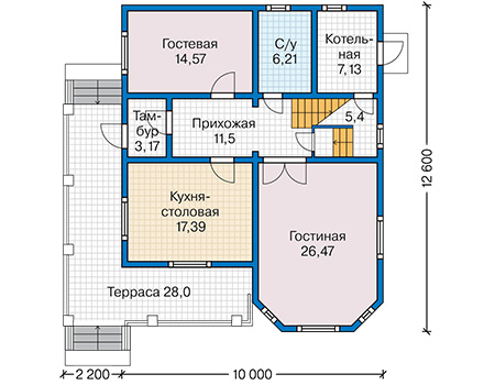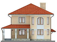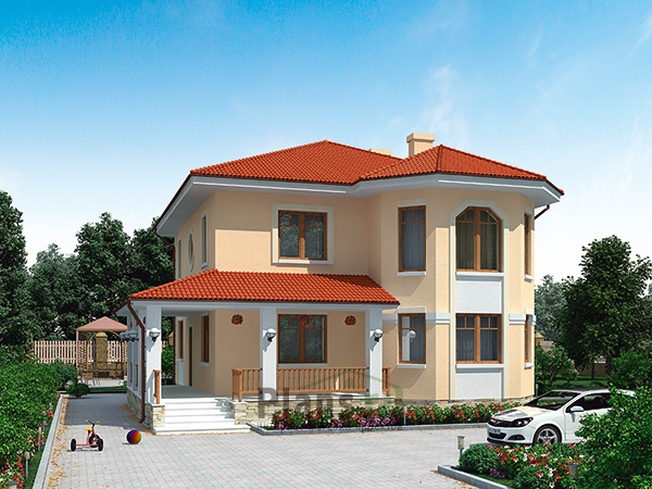 Красиво смотрится фигурный эркер, выступающий рядом с парадным входом. В нём находится часть гостиной. Благодаря эркеру форма этого помещения не традиционна, интересна с точки зрения планировки. Наличие четырёх окон делает гостиную очень светлой, визуально ещё просторнее.