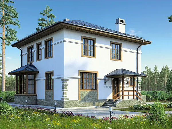 Красивый уютный двухэтажный дом с застеклённым крытым эркером на первом этаже выполнен в административном стиле. Общее впечатление от внешнего вида: добротное, монументальное здание без излишних архитектурных изысков.
