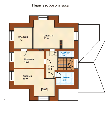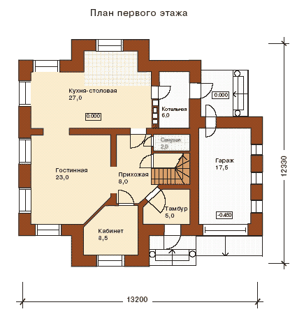 В этом кирпичном доме продуманная планировка и традиционность фасадов создадут комфорт круглогодичному проживанию семьи из 3-5 человек. Основной фасад и торец здания украшены колоннами. В доме предусмотрен гараж на одну машину. Два этажа здания связывает между собой удобная лестница, продуманно расположена в правом крыле. На первом этаже, кроме вспомогательных помещений, расположен их типовой состав. Именно здесь все члены семьи проводят большую часть времени: кухня-столовая, гостиная, кабинет. Второй этаж коттеджа - это зона личных апартаментов владельцев, связанные холлом: три спальных комнаты, два санузла и ванная. Игровая комната, в случае необходимости, может быть переоборудована под дополнительную спальню для гостей. Отсутствие в доме цокольного этажа позволяет возвести дом на участках с высоким уровнем грунтовых вод. Дом предназначен для круглогодичного проживания.
