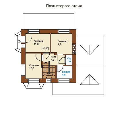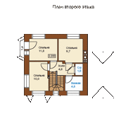 Основная часть первого этажа принадлежит кухне-столовой и просторной длиной гостиной комнате площадью 24,3 кв. м., из которой оборудовано два выхода на террасу за домом. Еще три комнаты коттеджа находятся на втором этаже и предназначены для оборудования в них спален, при этом одна из комнат имеет персональный балкон размером 1,4 кв. м.