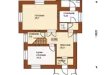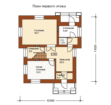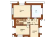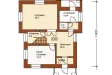 Техническое помещение котельной в доме размещено на первом этаже и представляет собой сквозное помещение, позволяющее пройти из прихожей дома на задний двор. Еще одно вспомогательное помещение, кладовая, имеет достаточно небольшую площадь, всего 3,3 кв. м., и размещается за лестницей. Наибольшая часть этажа традиционно принадлежит гостиной комнате, имеющей правильную квадратную форму и занимающей площадь 28,7 кв. м. Удобная кухня-столовая размером 16,5 кв. м. располагается сразу же слева от парадного входа.