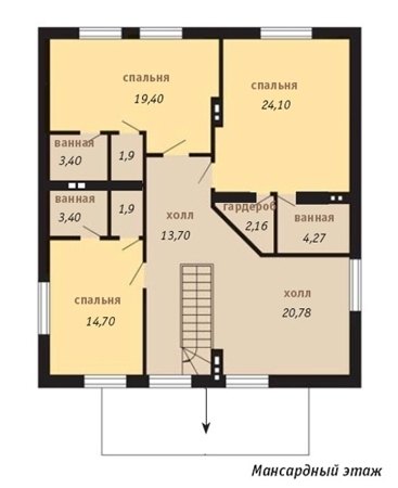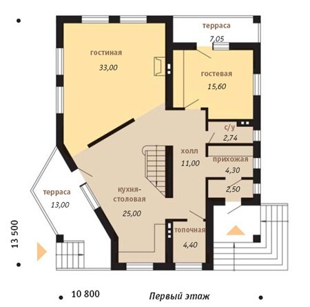 Необычной формы гостиная, расположенная на первом этаже и оборудованная камином, имеет площадь 33 кв. м. К ней примыкает кухня-столовая размером 25 кв. м. Тут же на этаже находится и небольшая гостевая комната, назначение которой может быть также изменено на любое другое, например, под кабинет. Из нее предусмотрен отдельный выход на придомовую террасу. Холл практически совпадает с кухней и разделен с ней только широкой лестницей на второй этаж, где запроектировано три спальни с собственными санузлами и гардеробными.