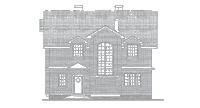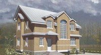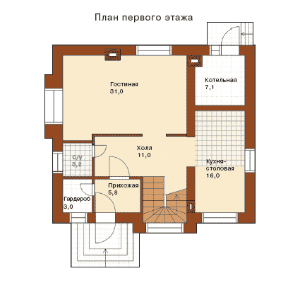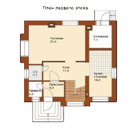 Коттедж с небольшой площадью в 144,8 кв. м. имеет простые квадратные формы и полностью оправдывает свое предназначение для постоянного проживания. Множество выступающих элементов придают фасаду одновременно украшенный и строгий вид, а большой витраж, сопровождающий лестницу почти по всей высоте, служит изысканным акцентом во всем экстерьере. Вход в дом предваряет маленькое крытое крылечко, а далее можно пройти в небольшую, всего 5,8 кв. м., прихожую. Довольно просторный холл размером 11 кв. м. вмещает в себя лестницу на второй этаж и позволяет свободно попасть во все помещения первого этажа.